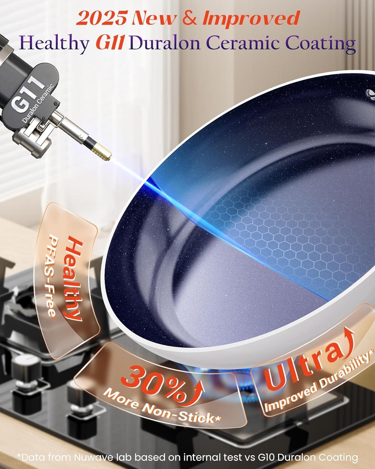 2025 NEW & UPGRADED G11 DURALON BLUE CERAMIC – Experience the all-natural, healthy G11 Duralon Blue ceramic coating with advanced sol-gel nano technology. It boosts 30% better non-stick performance and is more scratch resistant than G10. Non-toxic and free of harmful substances even at higher temperatures, it ensures a safe, superior cooking experience.